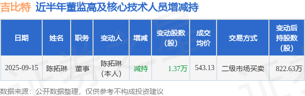 证券之星消息盈远期策略,根据9月16日市场公开信息、上市公司公告及交易所披露数据整理,吉比特(603444)最新董监高及相关人员股份变动情况:2025年9月15日公司董事陈拓琳共减持公司股份1.37万股,占公司总股本为0.019%。变动期间公司股价上涨2.03%,9月15日当日收盘报542.78元。