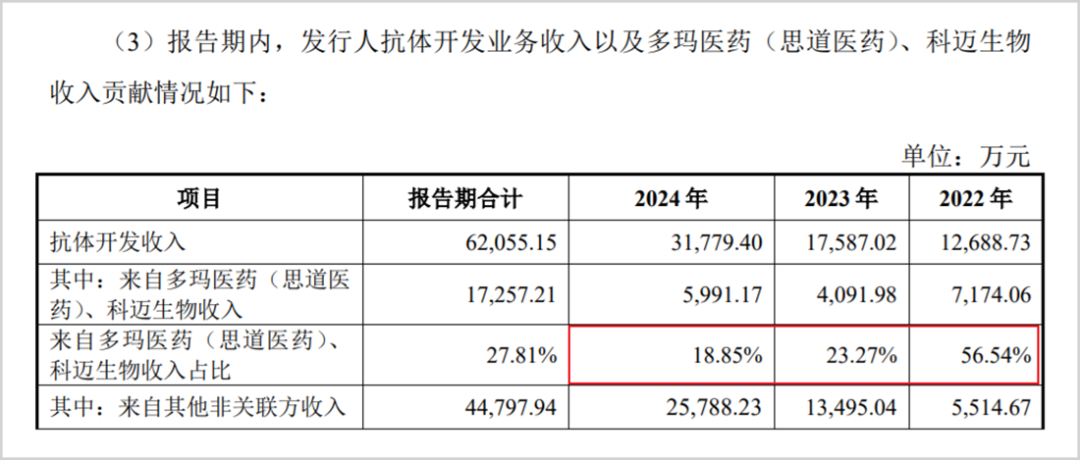 数据显示,思道医药、多玛医药、科迈生物作为关联方,早在2022年来自三家的收入占抗体开发收入比重过半,即便到2024年降至18.85%,比重仍然不低。