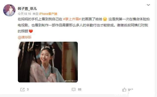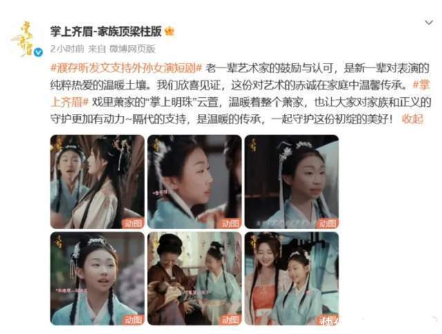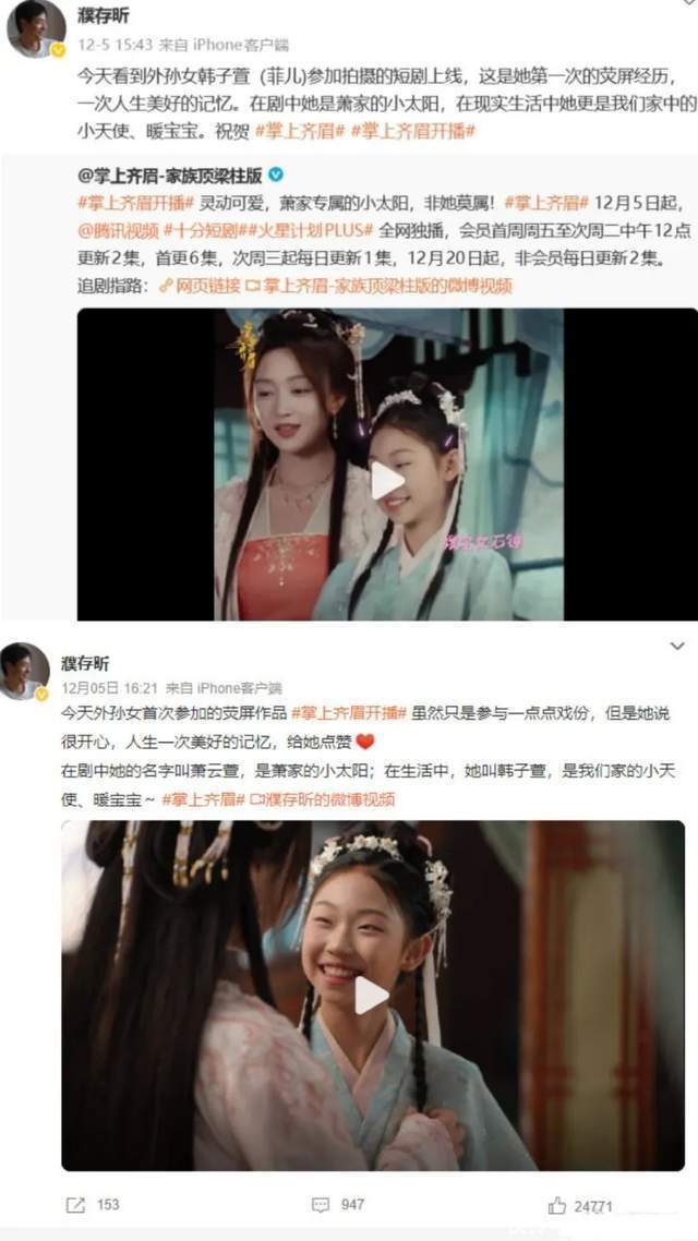 濮存昕外孙女韩子萱出道拍摄的短剧《掌上齐眉》播出股升网,其饰演角色为“萧云萱”,戏份较少。濮存昕出于鼓励孙辈勇于尝试的目的,便十分高调的发布多条动态为外孙女的荧幕首秀打call,本意为借助自身名气为孙女出道铺路,让她能够尽早获得关注。谁知因为外孙女的相貌过于普通,引起了网友们的集体抵制。虽说出生在明星世家的孩子耳濡目染,对于娱乐圈的工作怀有一定的憧憬。