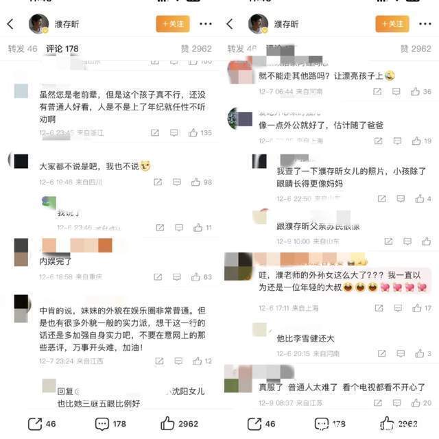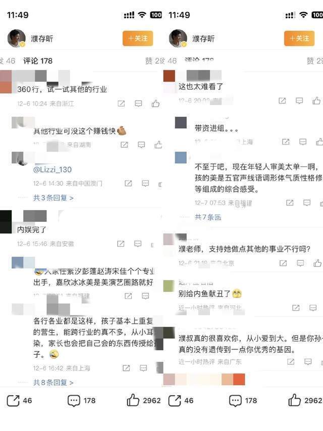 明星效应从另一个角度来看依赖的是粉丝经济,粉丝大都是由普通观众转化而来,这个过程不仅依赖优秀的作品和出彩的角色,演员颜值才是一眼定生死的先决条件。由于近些年来的明星颜值普遍腰斩,导致观众们已经受够了资本家丑娃娃对于审美的霸凌,对于这个颜值一般,却跃跃欲试准备进圈的濮存昕外孙女自然没啥好感。此前11月,濮存昕就带着孙女韩子萱参加节目。