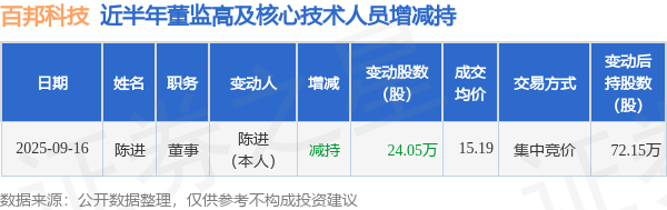 证券之星消息久联优配,根据9月16日市场公开信息、上市公司公告及交易所披露数据整理久联优配,百邦科技(300736)最新董监高及相关人员股份变动情况:2025年9月16日公司董事陈进共减持公司股份24.05万股,占公司总股本为0.1889%。变动期间公司股价上涨7.97%,9月16日当日收盘报15.31元。